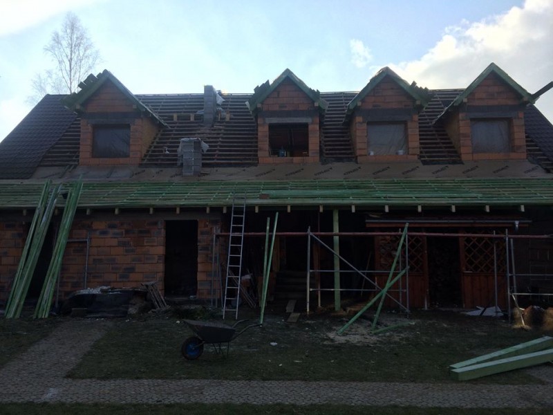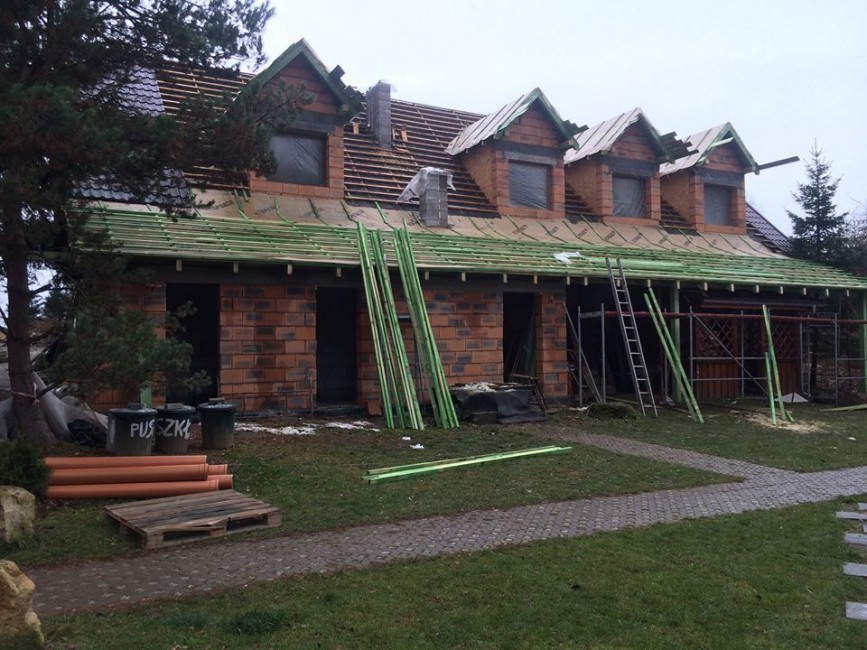 Z dumą przedstawiamy postępy prac w naszej stodole - ostatni wpis, kiedy informowaliśmy o bieżącym stanie inwestycji miał miejsce 27 października, czyli prawie równo miesiąc temu. Co przez ten czas się zmieniło..? Otóż bardzo dużo, ale po kolei: powstały stropy oraz zostały wylane schody prowadzące na piętro w części gościnnej. Zostały wymurowane oraz pokryte dachami dobudówki (z jednej strony zaplecze kuchenne, z drugiej zaś pomieszczenia techniczne), równocześnie na ukończeniu jest już zadaszenie nad wejściem do części gościnnej - obecnie pod powstającym zadaszeniem znajduje się drewutnia, która docelowo zostanie stamtąd usunięta, dzięki czemu powstanie bardzo atrakcyjne patio dla naszych gości. Najważniejsze jest jednak to co wydarzyło się na dachu głównym stodoły, dzięki temu nabrała ona finalnego kształtu - pojawiły się lukarny, dokładniej osiem sztuk, są już zadaszone i czekają na okna. Dodatkowo za nami są już najcięższe roboty ziemne, dzięki czemu od teraz będzie już tylko ładniej - do stodoły trafił prąd a odprowadzona została kanalizacja. Efekty widoczne są oczywiście na załączonych zdjęciach - jeśli posiadacie tak bujną wyobraźnie jak my to na pewno już widzicie jak niezwykłe i piękne miejsce powstanie już niebawem, nie możemy się doczekać!